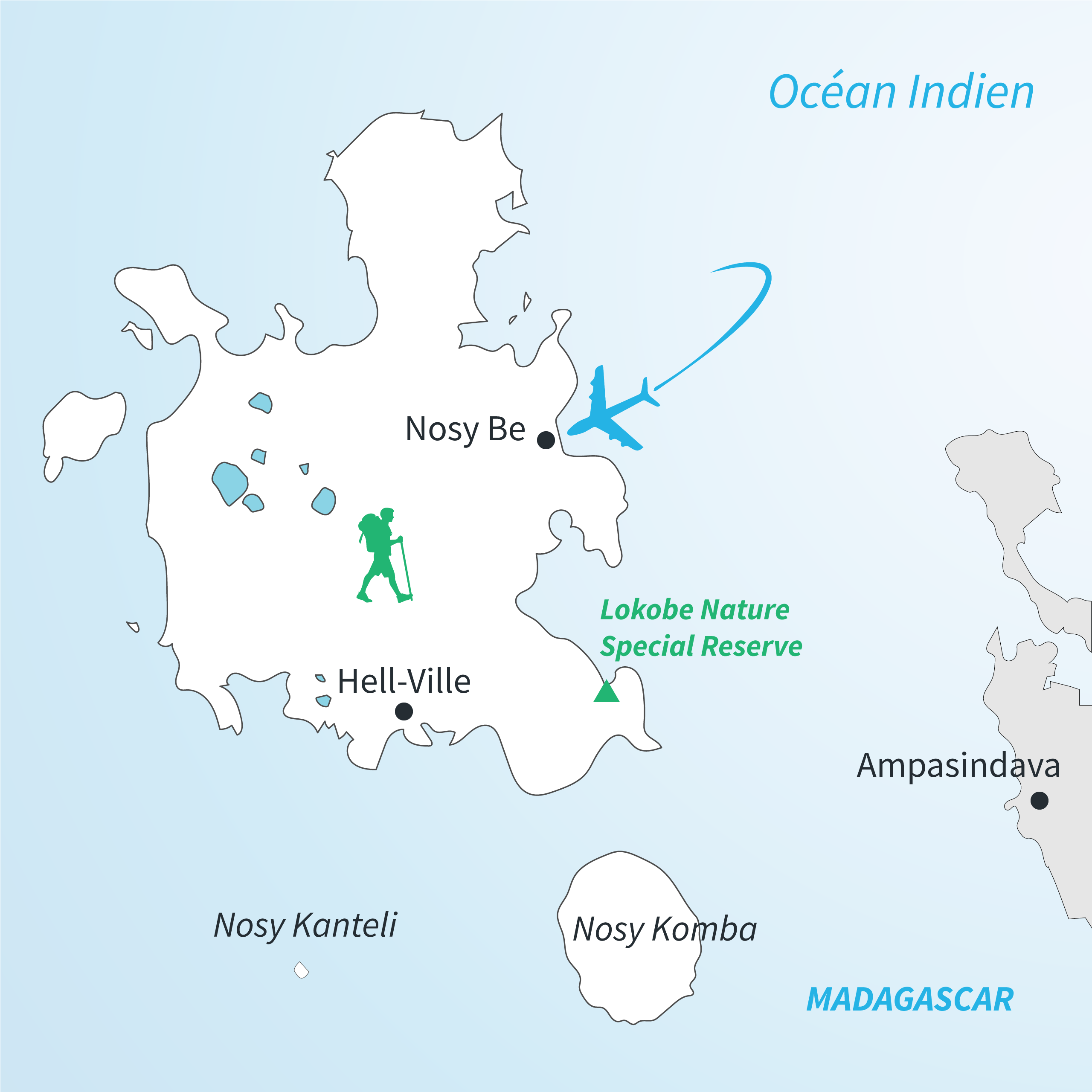 Convocation à l’aéroport selon horaires de vol. Formalités d’enregistrement et vol à destination de NOSY BE (avec escale).